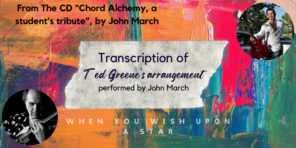 This is a transcription of my interpretation/recording of Ted Greene's arrangement of "When You Wish Upon a Star" and it includes the possibility of acquiring the PDF with tabs, the midi file associated with the transcription and a copy of the original recording and more. The performance and interpretation and recording are from my CD "Chord Alchemy, a student's tribute to Ted Greene." Available here: https://zenguitarguy.bandcamp.com/album/chord-alchemy-a-students-tribute-to-ted-greene-solo-jazz-guitar